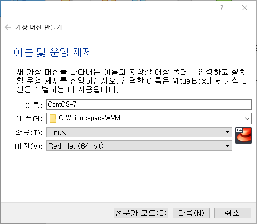 3. 가상 머신 이름, 저장 폴더 선택 후 종류:linux/버전:Red Hat(64bit) 설정