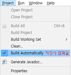 Build Automatically 체크되어 있으면 저장시 컴파일 한다.