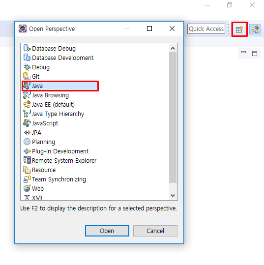 1. Open Perspective 클릭 → Java 클릭