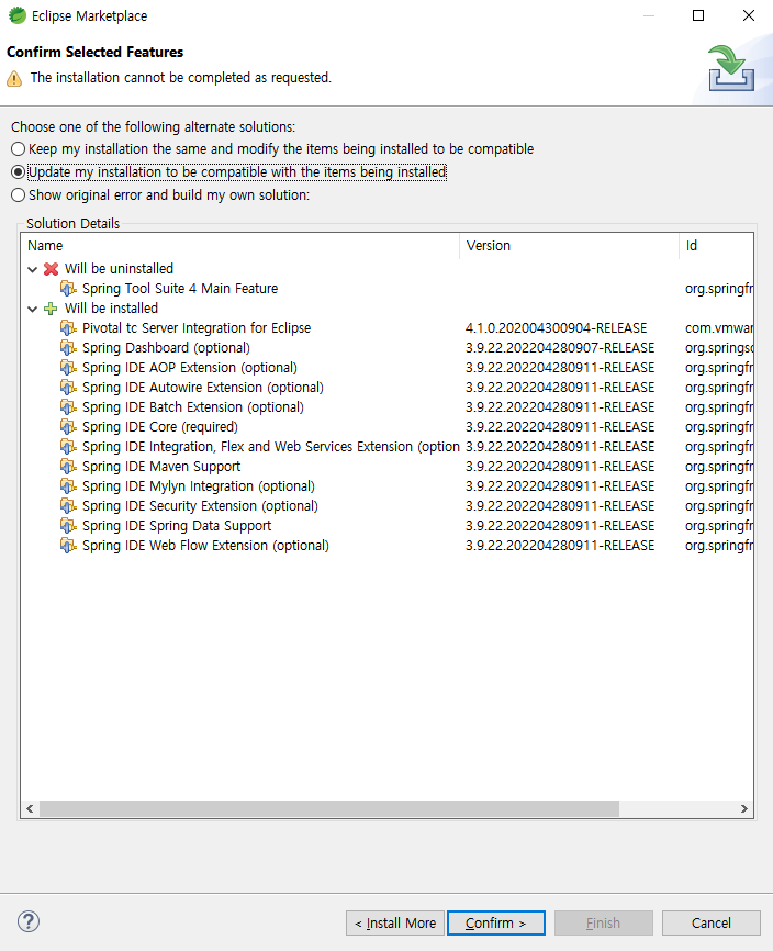 설치를 취소하려면 cancel을 클릭, sts3 for sts4 설치를 진행하려면 update my installation~~~ 선택한다. 이때 Spring Tool Suite 4 Main Feature이 삭제된다.