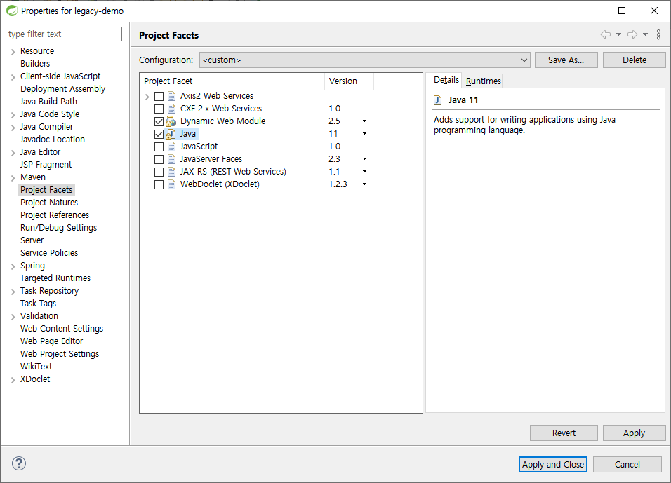 1. Project Properties > Project Facets > Java 11버전으로 바꿔준다. > Apply.