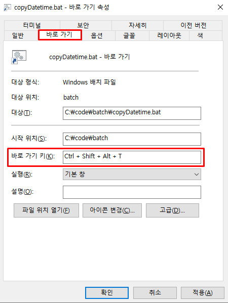 5. 바로가기 탭을 클릭 > 바로 가기 키를 지정한다. (키보드로 지정) > 확인 클릭