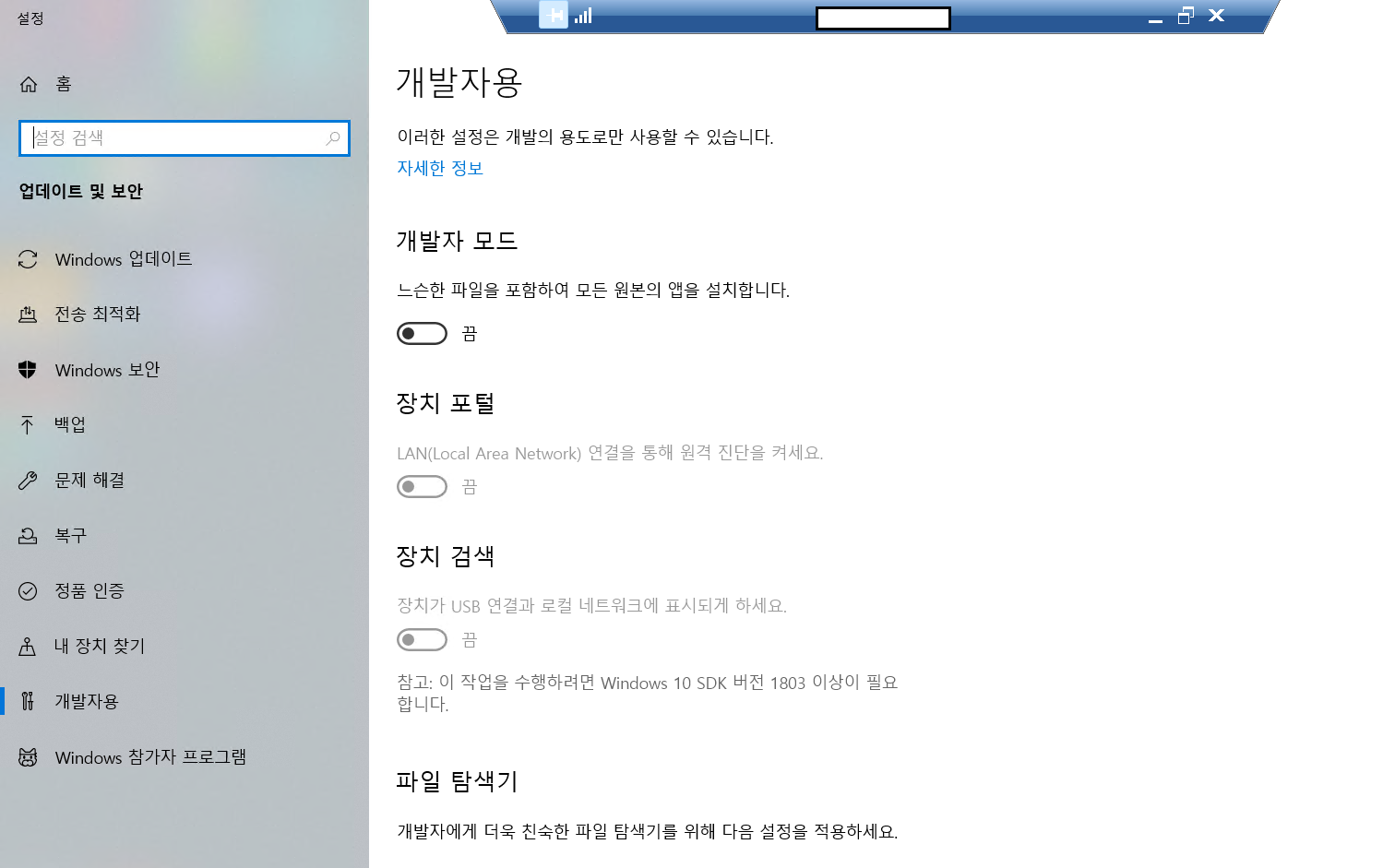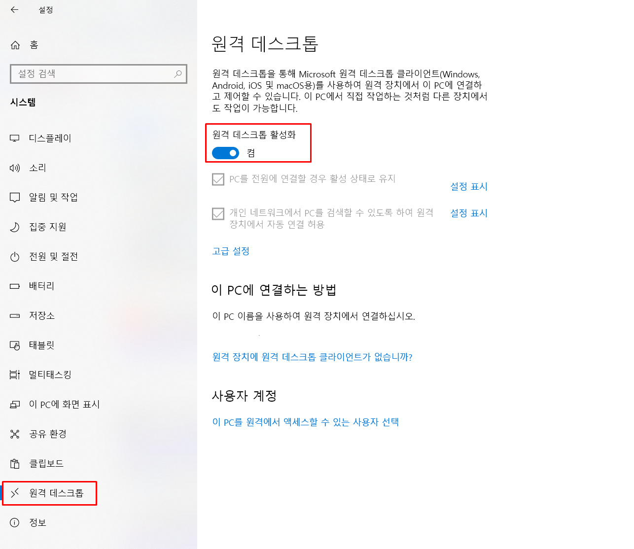 1. 윈도우 설정 > 시스템 > 원격 데스크톱 > 원격 데스크톱 활성화 를 킨다.