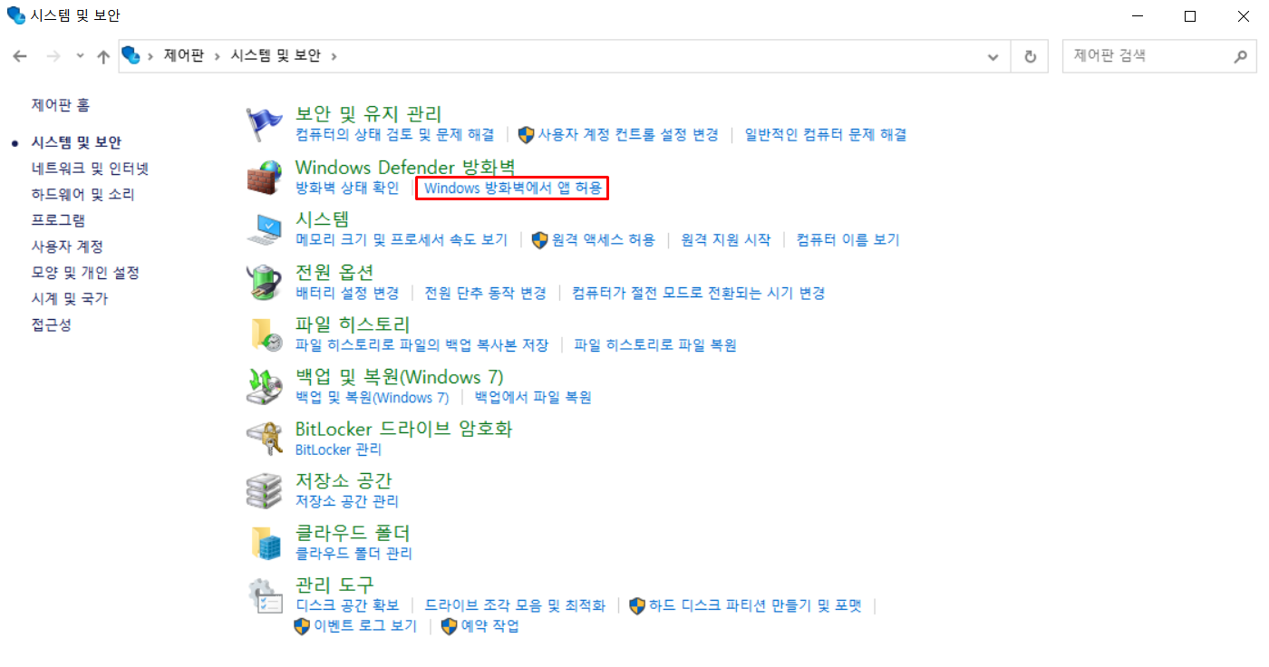 3. Windows Defender 방화벽 > Windows 방화벽에서 앱 허용 클릭