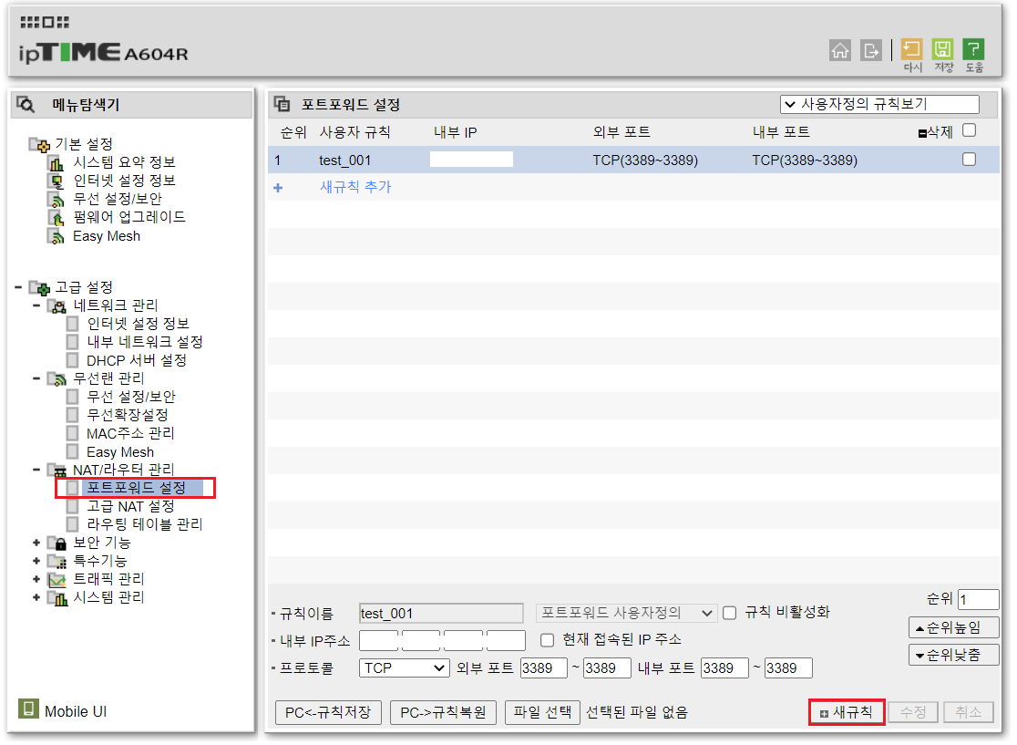 1. 공유기 관리자 페이지에서 고급 설정 > NAT/라우터 관리 > 포트포워드 설정에 들어간다.