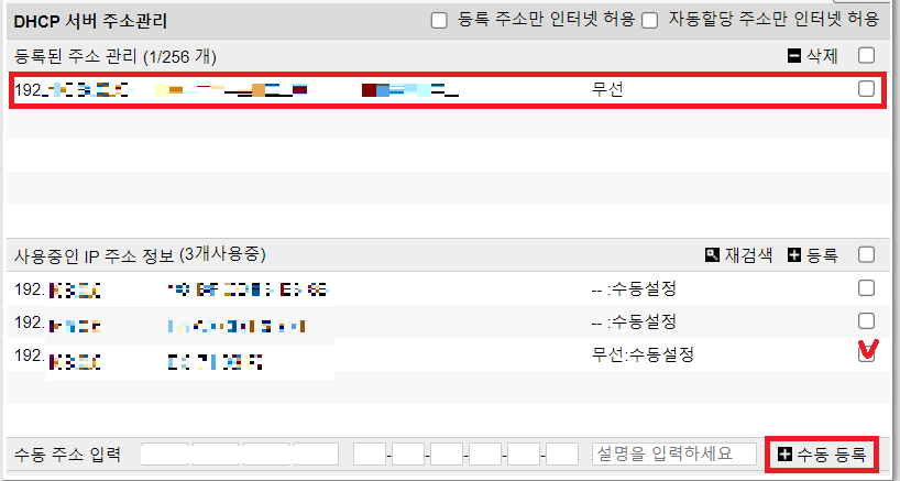 3. 고급 설정 > DHCP 서버 설정 > DHCP 서버 주소관리 에서 고정할 IP 를 선택 후 > 수동 등록 클릭