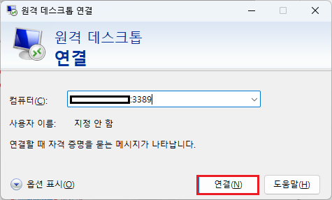 1. 원격 데스크톱 연결 실행 > IP:port 입력 > 연결 클릭