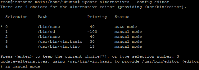 1. 아래 command를 입력하고, 사용하고자 하는 에디터의 번호를 입력하여 변경한다.